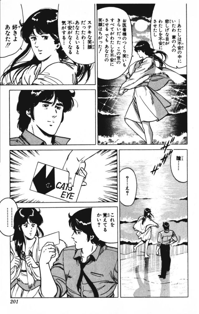 找到了,虽然,这个问题在《Cat's Eye》(80 年代的《猫眼三姐妹》)里找不到答案,毕竟北条司当年特么的匆匆烂尾了猫眼三姐妹,赶着去画城市猎人了……