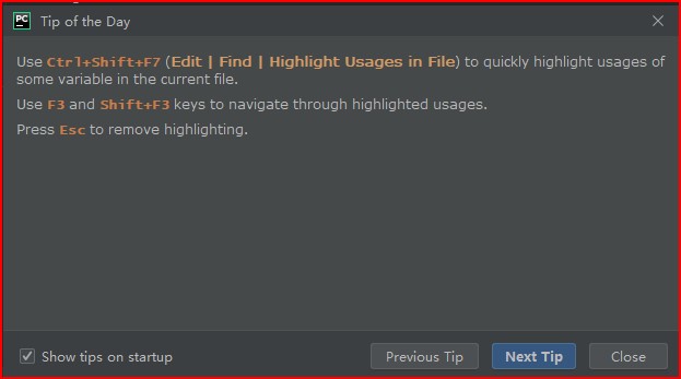 文章内容 2019/11/19 8:59:13,作 者: 黄兵 PyCharm每日提示 使用Ctrl + Shift + F7(编辑|查找|在文件中突出显示用法)可快速突出显示当前文件中某些变量的用法。使用F3和Shift + F3键浏览突出显示的用法。按Esc键删除突出显示。 上一篇:瞎扯 · 如何正确地吐槽 下一篇:成都的哪一点,让你很喜欢? 分享到: 发表评论 评论列表 搜索文章 文章分类 随笔 C# 前端技术 Linux 工程建设 ASP.NET MVC 经济管理 Entity Freamework GitHub 网络安全 The Art of SEO 数据库 创新、创意、创业 Angular Python 书籍收集整理 分布式消息队列 运维 安卓开发 Java Crawl IP Range 大数据 图片精选 文章归档 2016年11月 2016年12月 2017年1月 2017年2月 2017年3月 2017年4月 2017年5月 2017年6月 2017年7月 2017年8月 2017年9月 2017年10月 2017年11月 2017年12月 2018年1月 2018年2月 2018年3月 2018年4月 2018年5月 2018年6月 2018年7月 2018年8月 2018年9月 2018年10月 2018年11月 2018年12月 2019年1月 2019年2月 2019年3月 2019年4月 2019年5月 2019年6月 2019年7月 2019年8月 2019年9月 2019年10月 2019年11月 2019年12月 2020年1月 2020年2月 2020年3月 2020年4月 2020年5月 2020年6月 2020年7月 2020年8月 2020年9月 2020年10月 2020年11月 2020年12月 2021年1月 2021年2月 2021年3月 2021年4月 2021年5月 2021年6月 2021年7月 2021年8月 2021年9月 2021年10月 2021年11月 2021年12月 2022年1月 2022年2月 2022年3月 2022年4月 2022年5月 2022年6月 2022年7月 2022年8月 2022年9月 2022年10月 2022年11月 2022年12月 2023年1月 2023年2月 2023年3月 2023年4月 2023年5月 2023年6月 2023年7月 2023年8月 2023年9月 2023年10月 2023年11月 2023年12月 2024年1月 2024年2月 2024年3月 2024年4月 2024年5月 2024年6月 2024年7月 2024年8月 2024年9月 2024年10月 2024年11月 2024年12月 2025年1月 2025年2月 2025年3月 2025年4月 2025年5月 2025年7月 2025年8月 2025年9月 2025年10月 2025年11月
