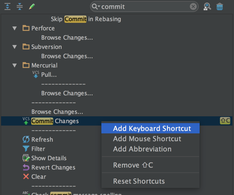 比如将代码变更 commit ,webstorm 默认是没有配置快捷键的,我们设置个 shift + c 。