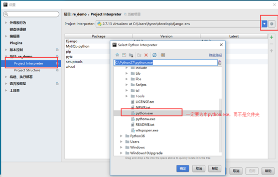在文件->设置->项目:xxx下找到Project Interpreter。然后修改为你需要的Python解释器。注意这个地方一定要注意的是:在选择Python解释器的时候,一定要选择到python.exe这个文件,而不是python的安装文件夹。