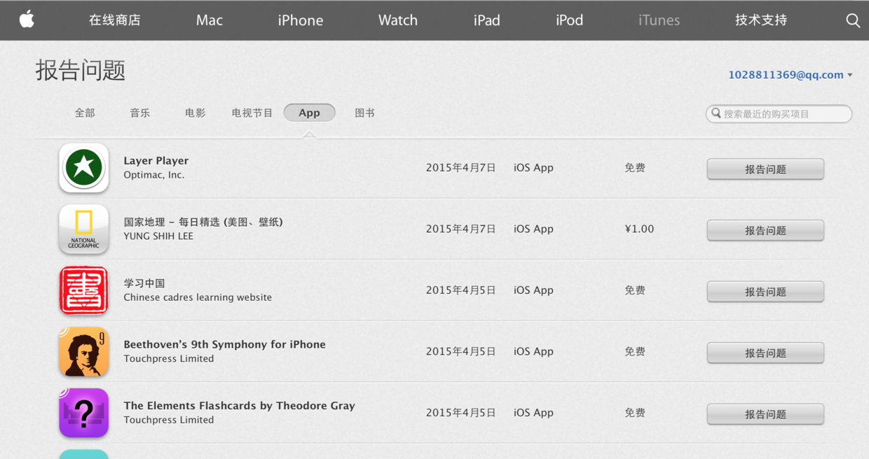 网站是报告最近 90 天购买的 iTunes Store、App Store、iBooks Store 或 Mac App Store 项目相关问题。