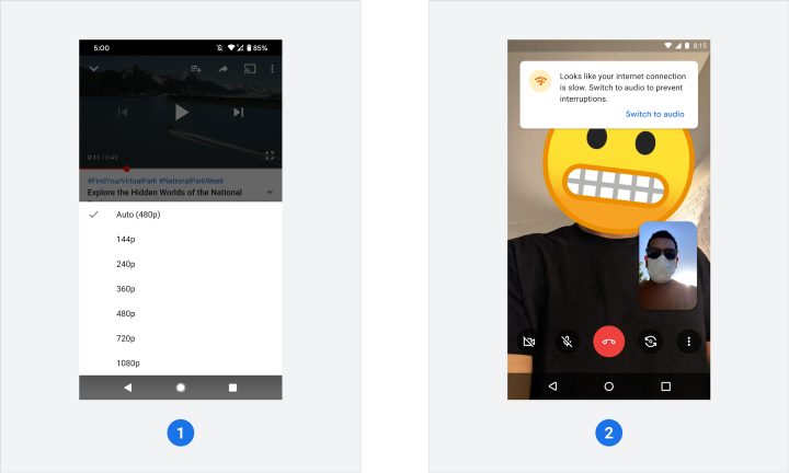 (1) YouTube的自适应比特率流允许视频分辨率自动适应网络条件。(2) 这个视频应用的例子可以检测到缓慢的网络连接,并建议切换到音频,以便进行无中断的对话。