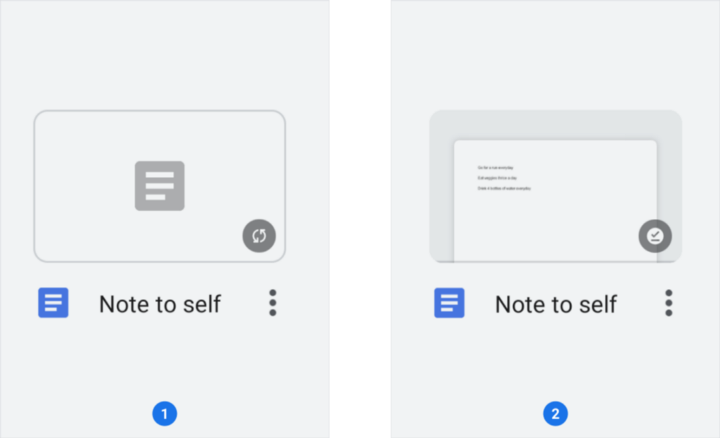 文件上有一个代表其状态的图标。左边的图片(1)显示等待状态,而(2)显示同步状态。