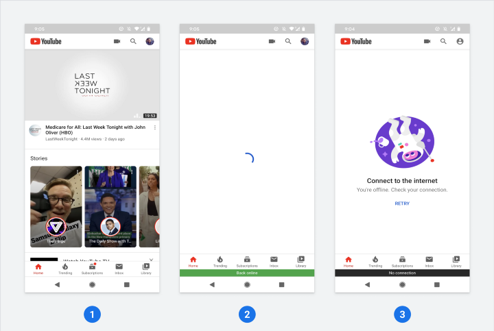 为所有类型的可能连接情况进行设计:成功、部分加载、无限期等待和完全失败。请看这些来自YouTube应用程序的例子。