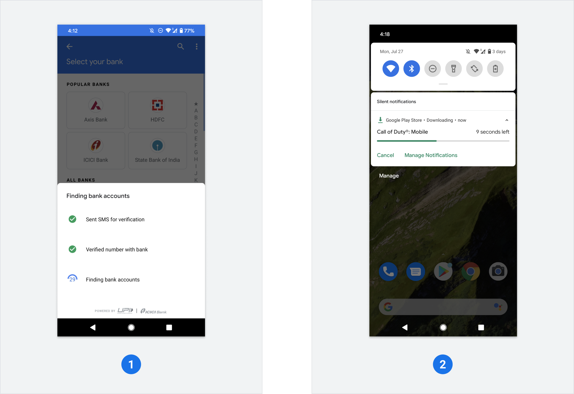 (1) 在谷歌的GPay印度应用程序中,在添加银行账户时使用的加载指标结合了一个确定的预期(固定的超时倒计时)和一个不确定的进度(围绕时间倒计时的圆形指标)。(2) 下载通知显示下载大型游戏文件还剩多少时间。