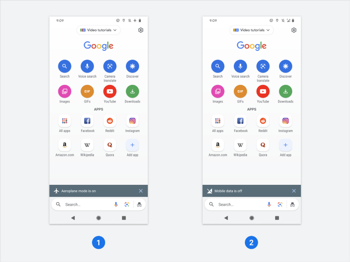 (1) Google Go应用程序显示用户在 "飞机模式 "下处于离线状态,并在工具栏中显示飞机模式图标和文字标签。(2) Google Go应用程序显示移动数据关闭的文本标签,并在应用程序的工具栏中显示信号蜂窝关闭图标。