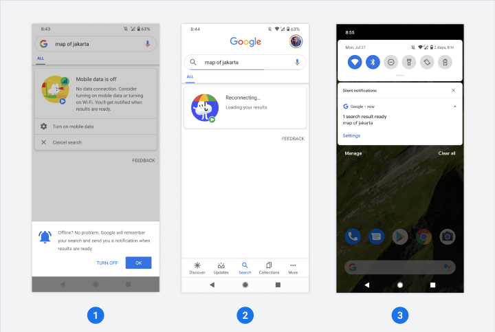 (1) 当用户在谷歌应用程序中进行搜索查询,而没有互联网连接时,该应用程序提出在结果准备好时通知用户。(2) 一旦设备连接到互联网,该应用程序就会自动尝试获取搜索结果。(3) 如果用户没有打开谷歌应用程序,当搜索结果准备好时,该应用程序会发出通知。