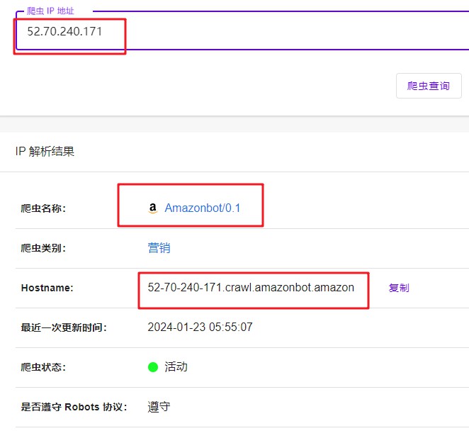 如果你觉得以上方法比较麻烦,可以直接通过爬虫识别网站,输入 Amazonbot 的 IP 地址,即可判断是否是真正的 Amazonbot 爬虫。