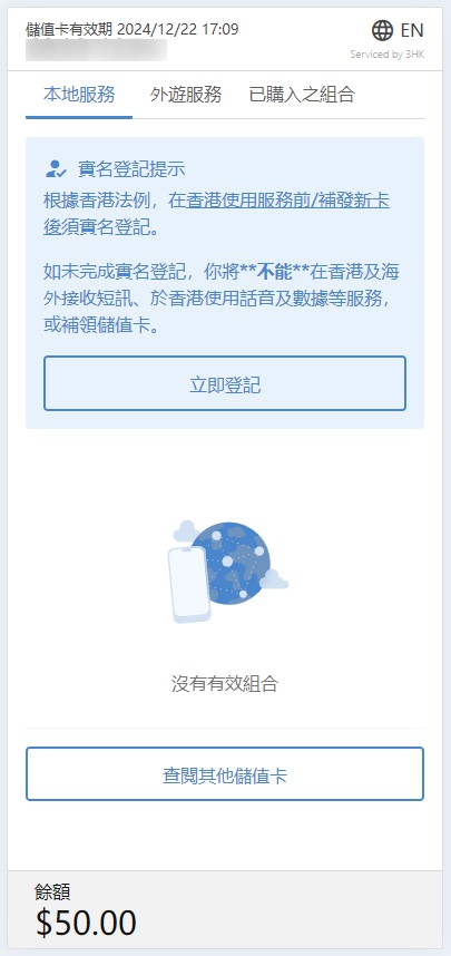 可以看到账户余额已经变成 50港币,同时有效期也到了 12 月 22 日。
