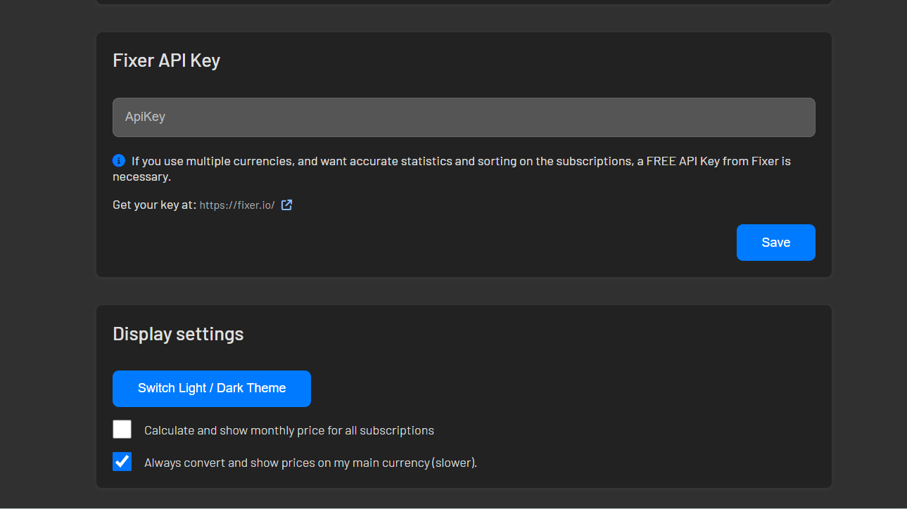 然后我们回到我们搭建的Wallos,点击头像旁的小箭头,点击setting选项进入设置界面。滑到下面,可以看到 Fixer API Key 一栏,填入你刚才获取到的api key点击save即可。你可以选择DisPlay setting一栏中第二个选项,使你输入的外币账单在展示时直接转换为人民币展示。