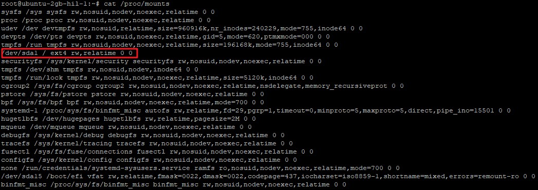 该命令会列出所有已经挂载的文件系统。注意一下哪个盘是启动盘以防止后面不小心将其格式化了,比较常见的挂载是在根目录(/)下的 sda 设备,也可以通过查看 /proc/mounts 找到那个目录是 roofs: