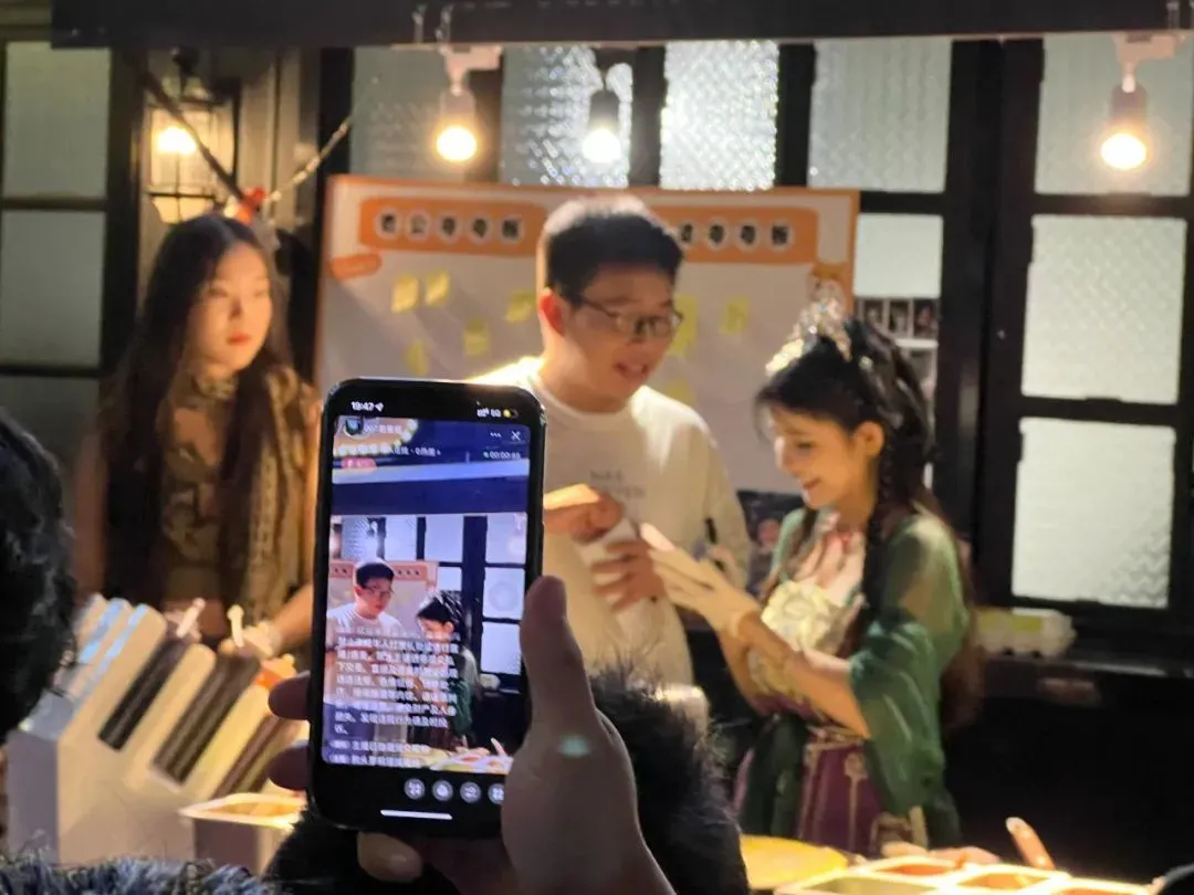 “老公”小熠选了比心,于是两人的手举起来,虚虚地比出个“心”的形状。拿相纸、写字、卷煎饼装袋、再次表达感谢挥手说再见……狗头萝莉一气呵成,送走小熠之后的短暂空隙,她小小喝了一口水,迅速地招呼下一位:“老婆老婆,快来。”