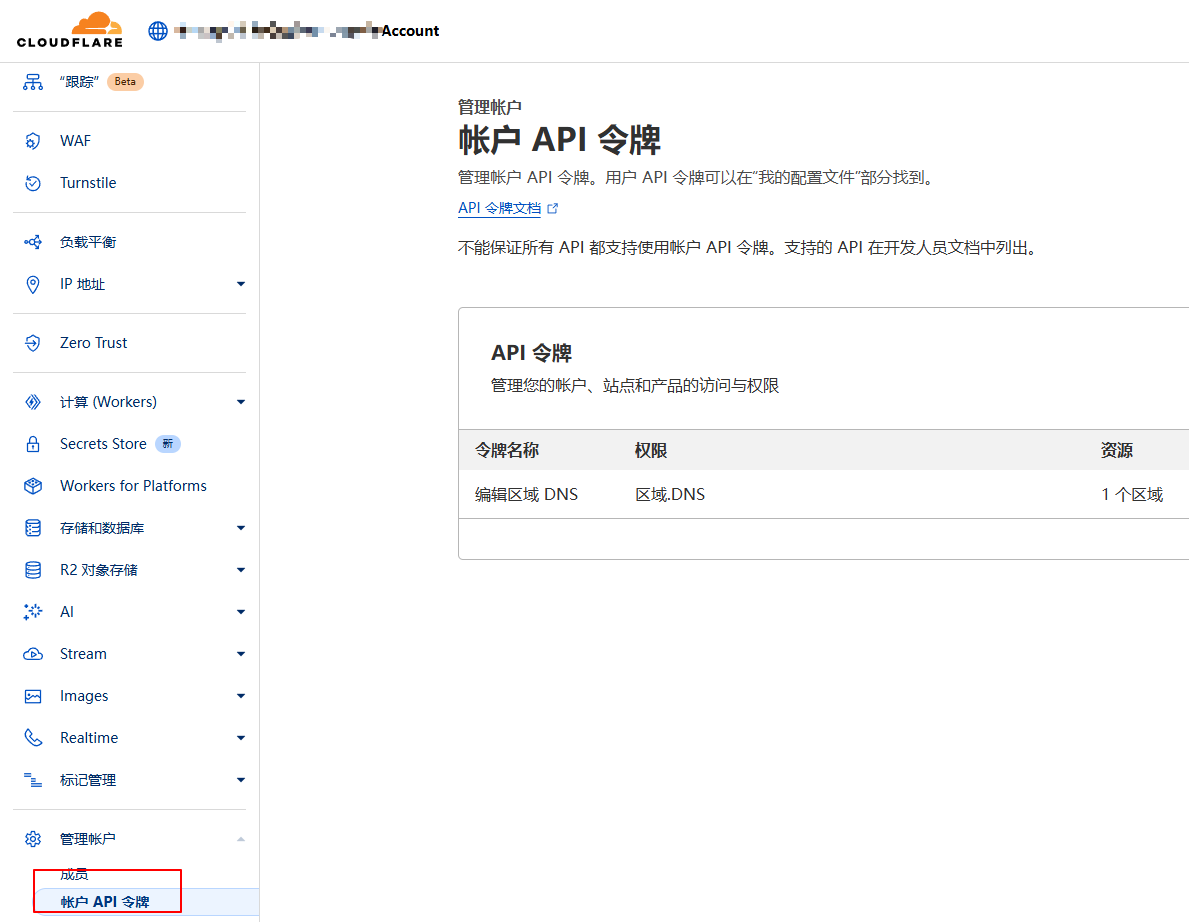 在 Cloudflare 控制台 找到 管理账户,账户 API 令牌,截图如下: