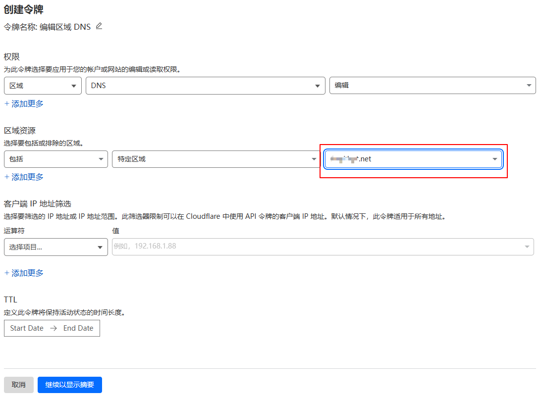 选择模板 Edit zone DNS,并赋予您需要的 Zone 域名的 DNS 编辑权限。