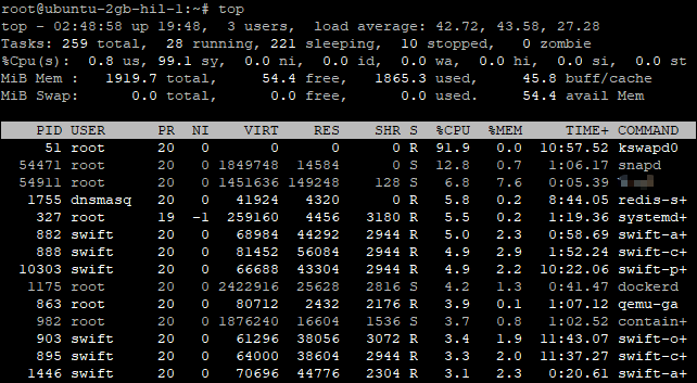 PID USER PR NI VIRT RES SHR S %CPU %MEM TIME+ COMMAND 51 root 20 0 0 0 0 R 95.0 0.0 1:34.21 kswapd0