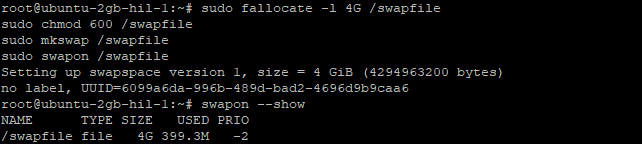 推荐 4 GB: sudo fallocate -l 4G /swapfile sudo chmod 600 /swapfile sudo mkswap /swapfile sudo swapon /swapfile 验证是否启用: swapon --show 结果如下: