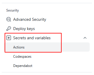 之后找到右边的菜单,Secrets and variables 这个选项下面的 Actions 这里很容易找错,所以着重强调。截图如下: