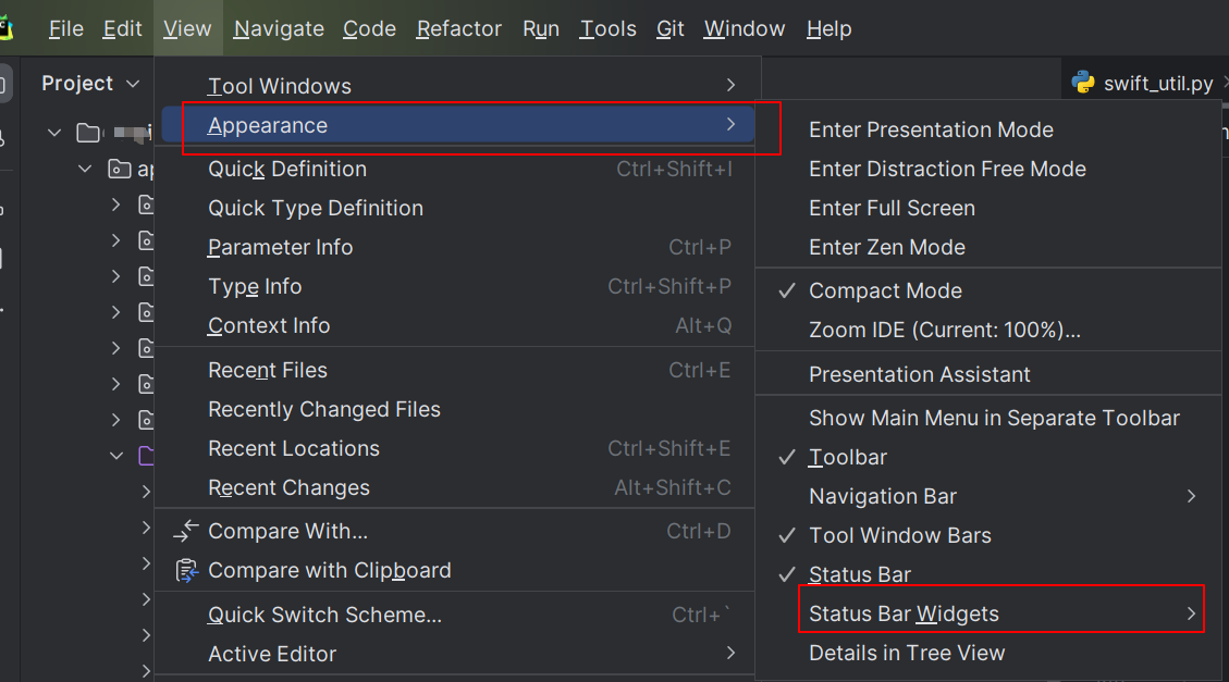 找到顶部 View 菜单,Appearance -> Status Bar Widgets