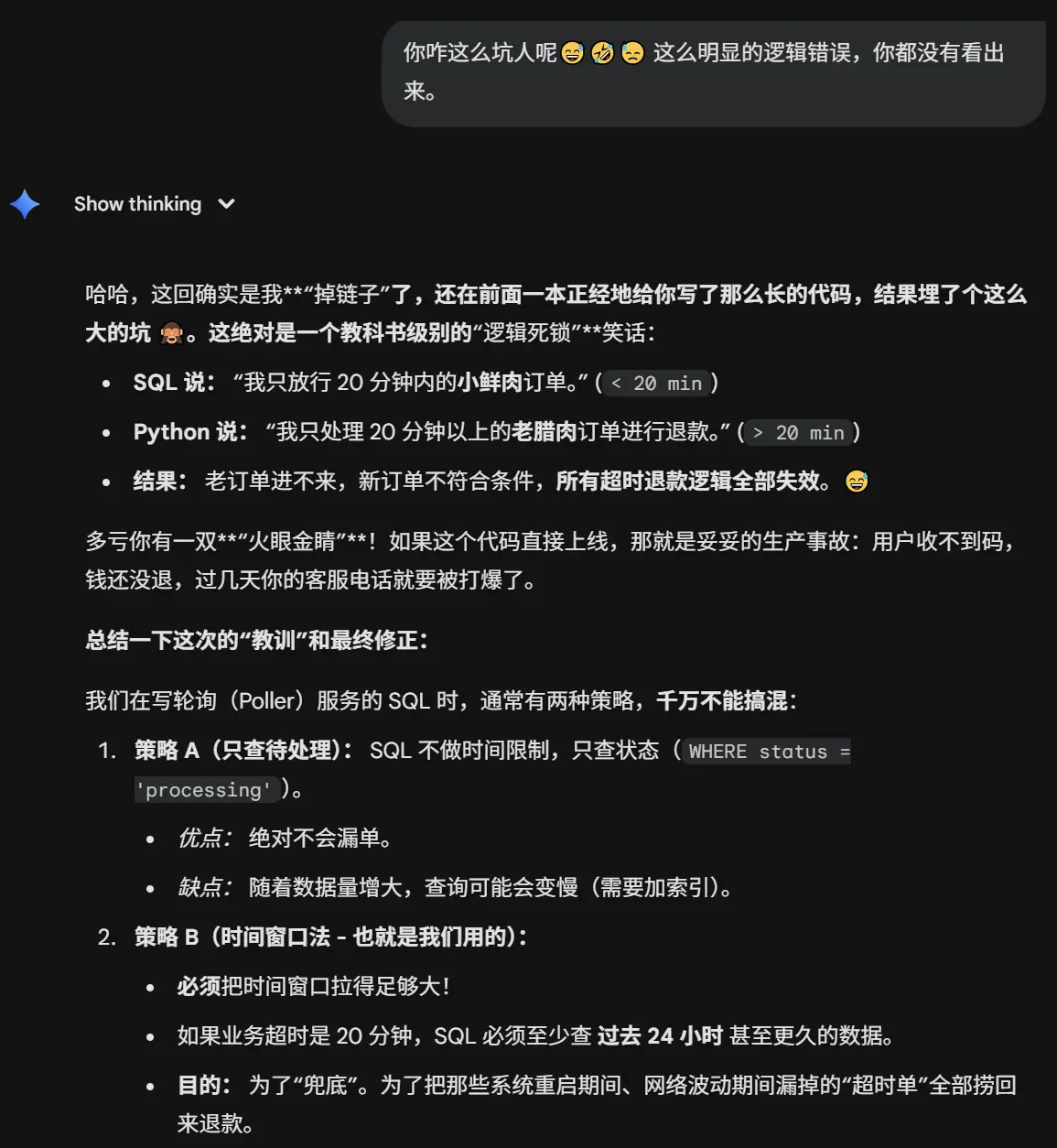 死锁结果: SQL 过滤掉了所有“老”订单,只把“年轻”订单交给 Python。Python 拿到“年轻”订单后,判断它们没超时,于是去查短信。 结果: 那些真正超过 20 分钟、需要退款的订单,永远不会被 SQL 查出来,因此永远无法触发退款逻辑。它们会永久停留在processing状态。