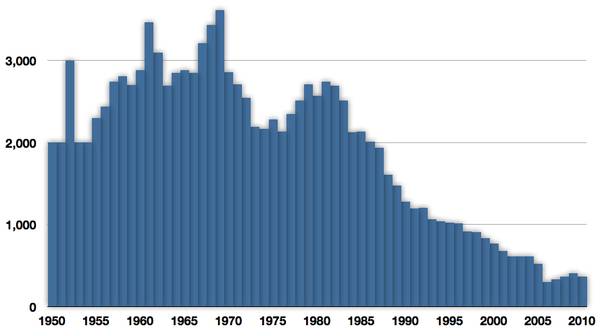 但很显然的,野生鳗鲡的数量本来就在减少,人们会捕捉它们吃掉,也会开发利用它们栖息生长的淡水河川,相应的,在马里亚纳繁殖出来的鳗苗肯定也变少了,而巨大的市场需求则刺激了鳗苗捕捞,这些越来越少的鳗苗被越来越多的捞起来、养大、吃掉,日本鳗鲡的种群规模,不可避免的走向崩盘。