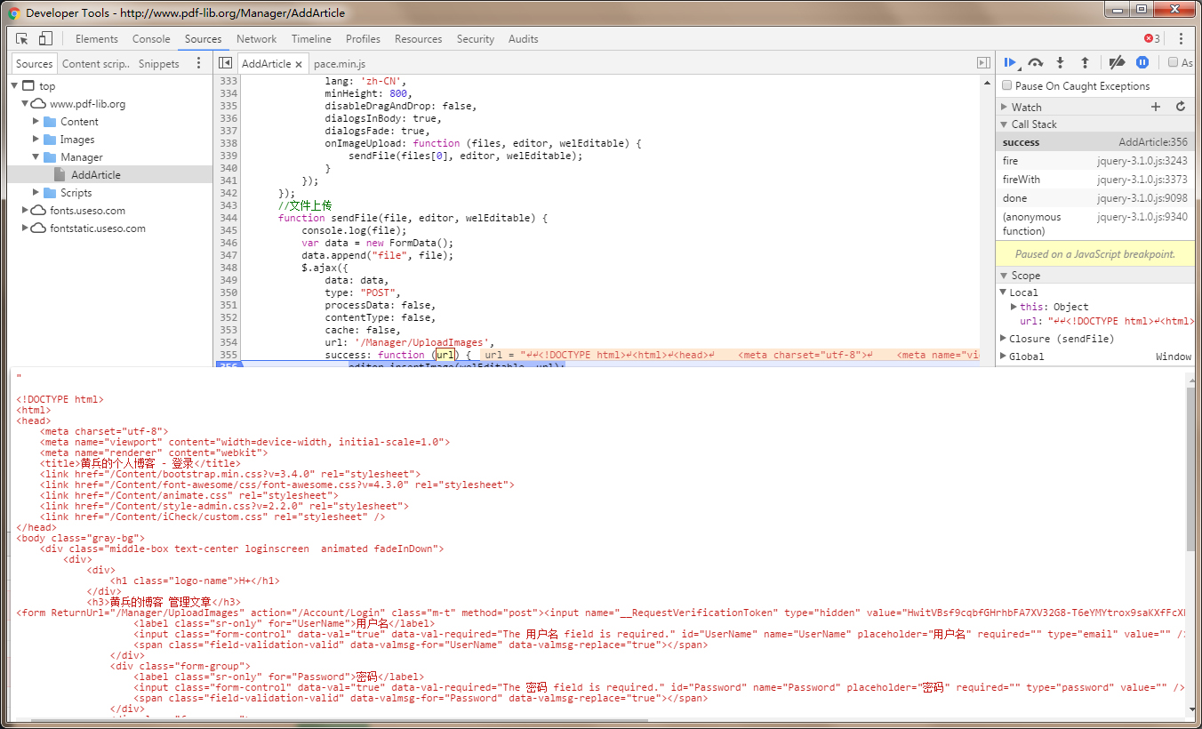 上图是在上传的时候返回了源代码,实在是让人匪夷所思,后经过查实,是由于上传图片的这个目录没有写权限,但是也没有报错,返回的是登陆页面的源代码,你说奇怪不奇怪?