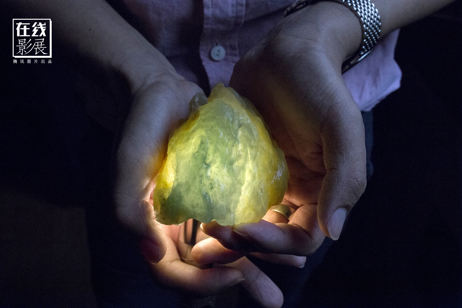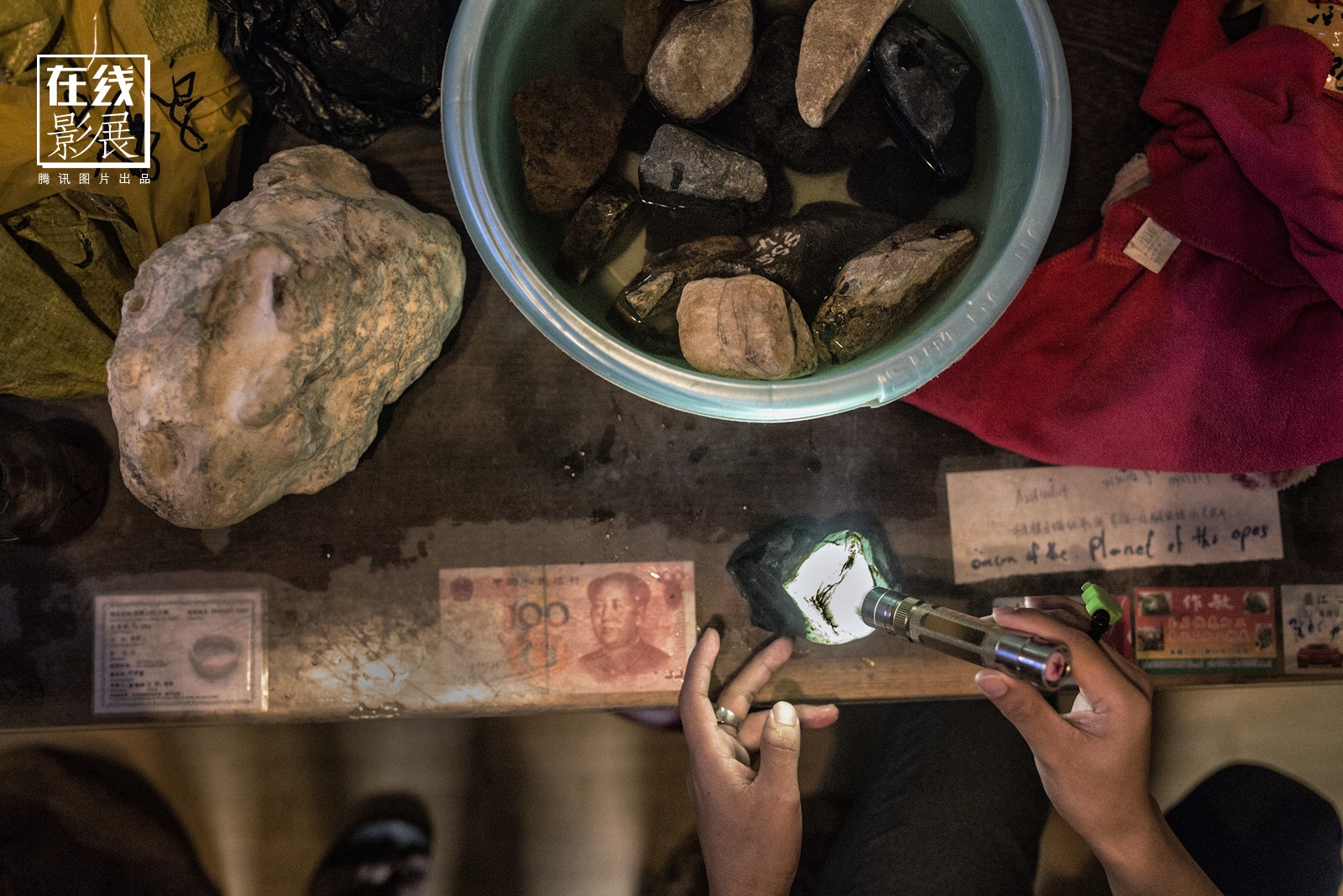 一名商人在中缅边境上的云南盈江县一家旅馆里展示一块翡翠原石。他估计在黑市上,这块石头至少值四五万美金。据几位缅甸黑市的贸易商说,盈江县几乎所有的原石都是从缅甸玉矿周围的黑市上走私来的。