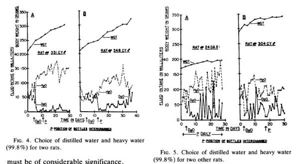 1976 年,JHU 的 Richter 用大鼠做了实验,在饮用水只能选择重水时,18 只实验鼠平均仅能生存 14 天,随时间变化,这些大鼠体重迅速下降,且自主摄入的重水量越来越少。[7] 他也发现,如果同时向实验鼠提供蒸馏水和重水,18 只实验鼠中的 14 只很快就开始分辨出重水和蒸馏水并且更多的摄入蒸馏水(互换两饮水瓶的位置它们也可以识别的出来,Fig. 4A),剩余的四只有另外的两种摄入模式(Fig. 4B & Fig. 5)。他认为这个现象可以这样解释:当实验前几日实验鼠摄入了较大量的重水时,它们将很快开始厌恶重水(可能因为大量摄入重水感到不适?);而当前几日大鼠摄入两种水的量接近时,大鼠可能很长时间都无法分辨重水和蒸馏水。