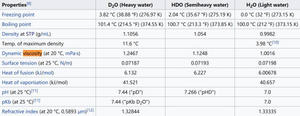图 3 D2O,HDO 和 H2O 的一些物理性质差别,自维基百科Heavy water - Wikipedia