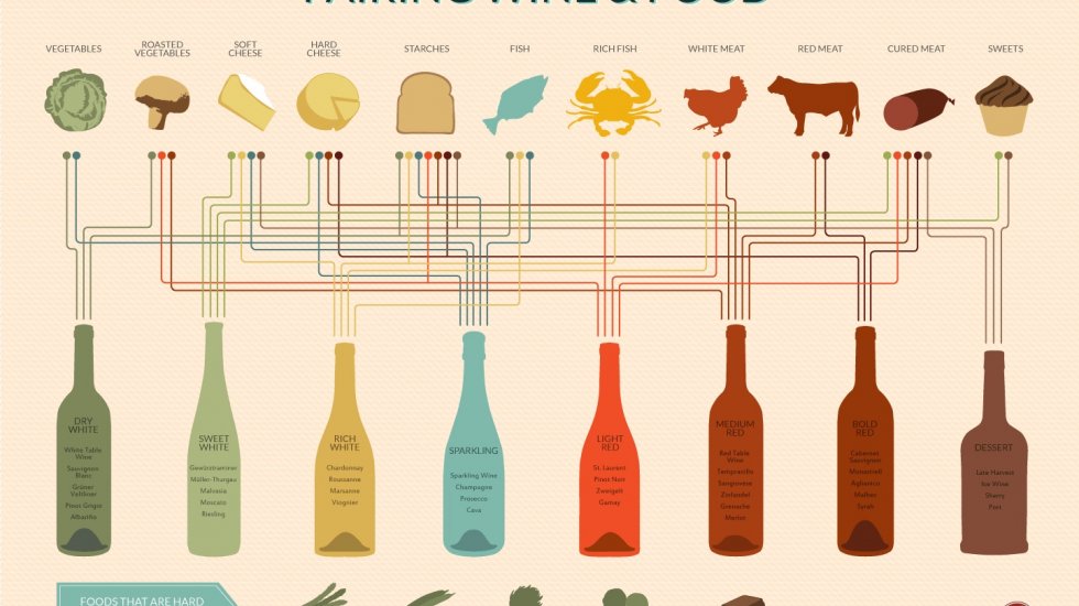 酒单中,有几样是必不可少的元素:葡萄酒类型、产地、价格、年份、和分级。绝大多数餐厅会根据葡萄酒类型,也就是我们最常说的红葡萄酒、白葡萄酒、桃红葡萄酒等等。客人可以先决定自己要喝什么类型的葡萄酒,再选择相应的产区和葡萄酒品牌。 决定一瓶酒价格的,是产地、分级、和年份。总体来说,勃艮第和波尔多某些产地的酒均价就比其他产地要高,老年份酒的均价比新年份酒要高。 餐酒搭配 关于餐酒搭配,很多人只知道“红酒配红肉,白酒配白肉” 这个原理,事实上,餐酒搭配最重要的不是酒和肉的颜色要搭配,而是酒和菜的颜色要搭配。以下是我为大家总结的不同葡萄酒的风格和适宜搭配的食物:
