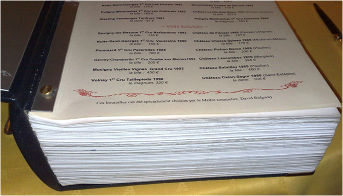 A la Bouteille一瓶酒 这部分才是一本酒单最重要的部分,占了90%的位置,也是最复杂的部分。4人或更多人一起吃饭时,点一瓶酒一起分享就更加划算了。 一个餐厅的酒单可以是任何形式的,没有任何对格式或排列方式的规定,这也让理解法国酒单变得更加困难。