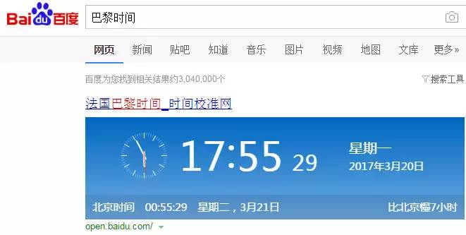 法国全国使用东一区时间(中国是东八区),根据夏时制或冬时制,中国比法国快6或7个小时。因此,当法国还是中午的时候,中国已经是晚上了。 那么,今年什么时候调表呢? 夏季时间在三月最后一个星期日把表拨快一个小时(2017年3月26日凌晨2时),冬季时间在十月最后一个星期日把表拨慢一个小时(2017年10月29日凌晨3时)。 可能你会觉得,这一切好复杂啊,现在法国到底几点了?办法很简单: 1. 在百度中输入“巴黎时间”