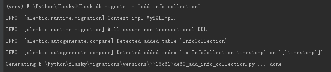 (venv) E:\Python\flasky>flask db migrate -m "add info collection" INFO [alembic.runtime.migration] Context impl MySQLImpl. INFO [alembic.runtime.migration] Will assume non-transactional DDL. INFO [alembic.autogenerate.compare] Detected added table 'InfoCollection' INFO [alembic.autogenerate.compare] Detected added index 'ix_InfoCollection_timestamp' on '['timestamp']' Generating E:\Python\flasky\migrations\versions\7719c617de60_add_info_collection.py ... done