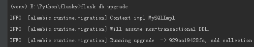(venv) E:\Python\flasky>flask db upgrade INFO [alembic.runtime.migration] Context impl MySQLImpl. INFO [alembic.runtime.migration] Will assume non-transactional DDL. INFO [alembic.runtime.migration] Running upgrade -> 929aa19428fa, add collection