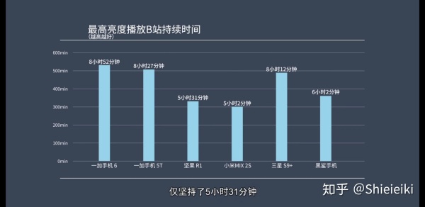 耗电程度:OLED 由于像素点独立工作,该亮的亮,该暗的暗,该灭的灭,LCD 无论显示什么颜色都是背光全开,所以 LCD 注定耗电,下图中坚果 R1 和小米 mix2s 还有黑鲨都是 LCD 屏幕,在长时间视频播放下续航可以看见明显吃亏。