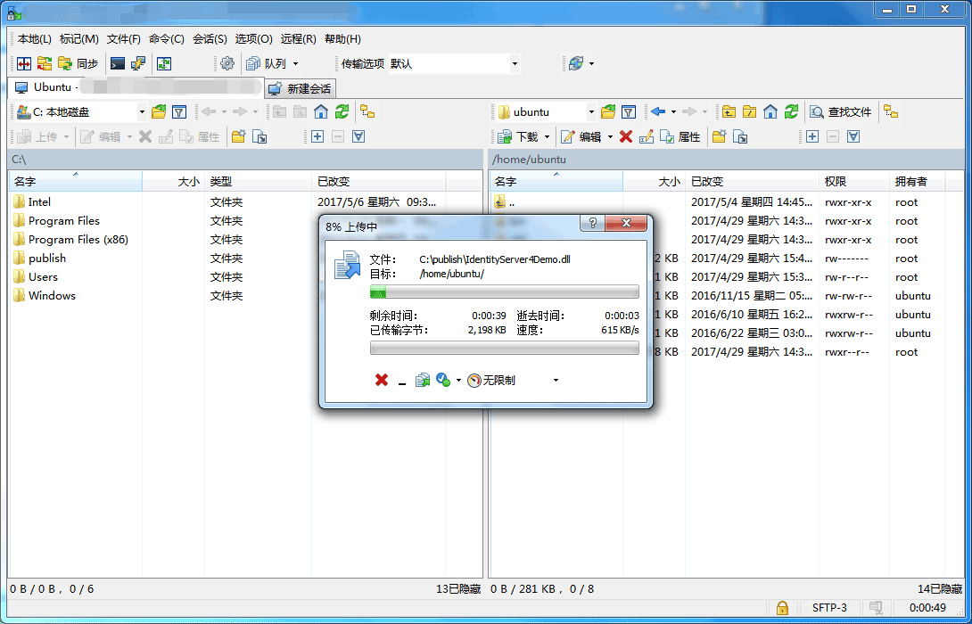 用WinSCP登陆服务起,把Publish文件复制到/home/ubuntu/目录下,如图: