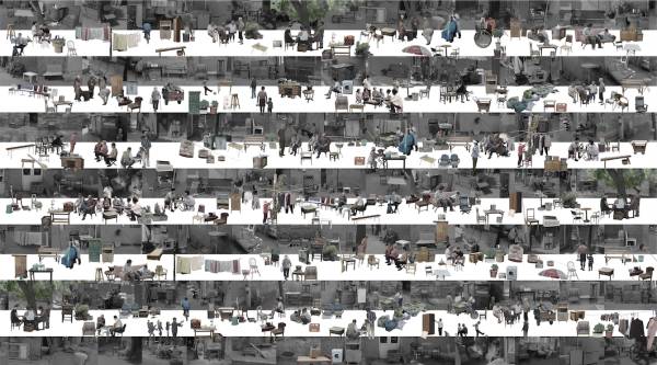 如果深入观察胡同里的生活,你就会注意到放在路 边的各种家具。板凳和椅子、沙发和桌子、晾衣服的地 方、案板、灶台、观赏植物、储物柜、健身器材、鸟笼、扫 帚、洗衣机、床,这些本来应该属于家庭室内独有的部分 都出现在胡同的路边供左邻右舍使用。于是,在一起乘 凉、一起做饭、一起围观下棋、一起观花赏鸟的生活场景 里,在共同使用着椅子、灶台、柴米油盐的时候,这些家 具就成为了一个契机使人们在周围自然产生了各种交流和 活动。我们的 “400 盒子的社区城市” 就是根据这样的 观察得出的未来共享社区生活的一种可能。