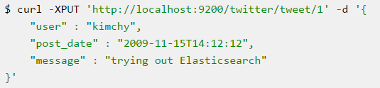 Elasticsearch很友好地提供了RestFul的API,可以通过HTTP请求直接完成所有操作。比如下面官方的一个例子,往索引twitter添加文档,type是tweet,文档的id是1: