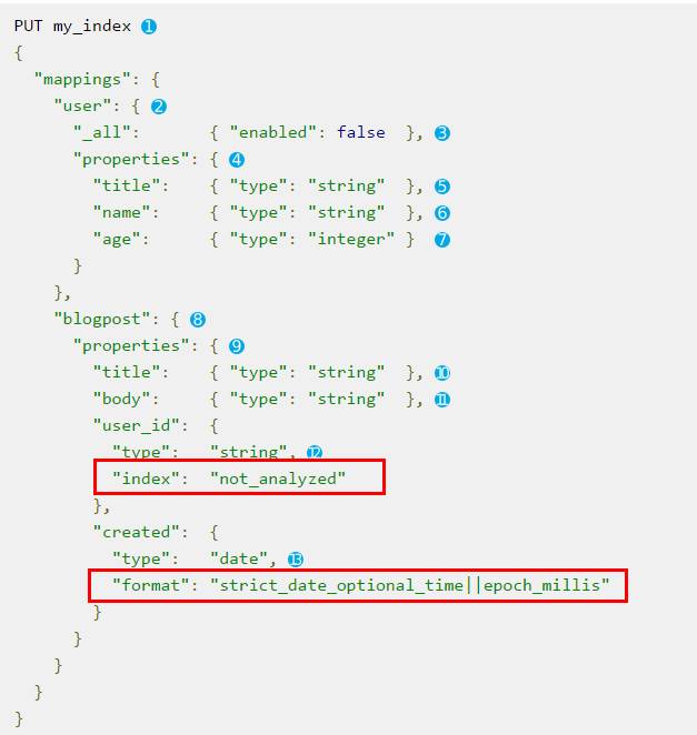 mapping类似于数据库里的表结构,定义个mapping就意味着创建了一个索引。与数据库不同的是,一个索引并不需要显示地建立mapping,比如,上面那个在twitter索引插入文档数据的例子,如果执行的时候还没有定义索引,ES便会根据文档的字段和内容,自动创建索引和mapping。然而,这样创建的索引字段,往往可能不是我们所需要的。所以,还是自己预先通过手动定义mapping来创建索引比较好。下面是创建mapping的例子,这个例子在my_index这个目录下,为user、blogpost这些type创建了mapping。其中properties下面是各种字段的定义,包括了string、数值、日期等类型的定义。