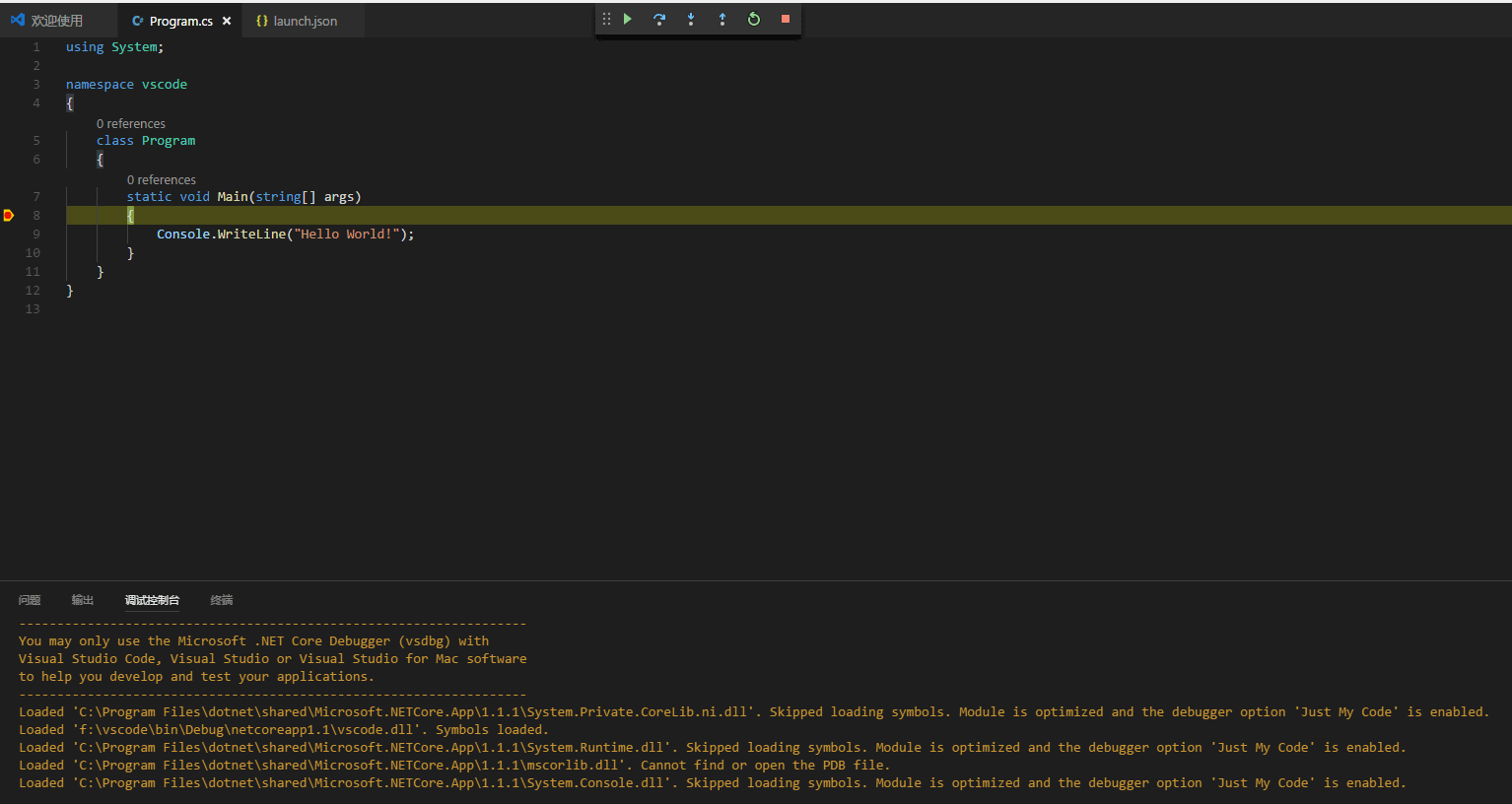 {"version": "0.2.0","configurations": [{"name": ".NET Core Launch (console)","type": "coreclr","request": "launch",//注意这里//"preLaunchTask": "build","program": "${workspaceRoot}/bin/Debug/netcoreapp1.1/vscode.dll","args": [],"cwd": "${workspaceRoot}","stopAtEntry": false,"console": "internalConsole"},{"name": ".NET Core Launch (web)","type": "coreclr","request": "launch","preLaunchTask": "build","program": "${workspaceRoot}/bin/Debug/<target-framework>/<project-name.dll>","args": [],"cwd": "${workspaceRoot}","stopAtEntry": false,"launchBrowser": {"enabled": true,"args": "${auto-detect-url}","windows": {"command": "cmd.exe","args": "/C start ${auto-detect-url}"},"osx": {"command": "open"},"linux": {"command": "xdg-open"}},"env": {"ASPNETCORE_ENVIRONMENT": "Development"},"sourceFileMap": {"/Views": "${workspaceRoot}/Views"}},{"name": ".NET Core Attach","type": "coreclr","request": "attach","processId": "${command:pickProcess}"}]}