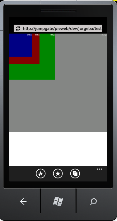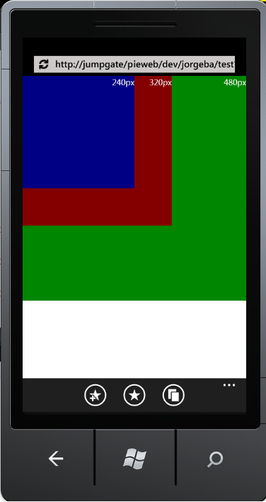 <!DOCTYPE html PUBLIC "-//W3C//DTD XHTML 1.0 Transitional//EN" "http://www.w3.org/TR/xhtml1/DTD/xhtml1-transitional.dtd"> <html xmlns="http://www.w3.org/1999/xhtml"> <head> <meta content="text/html; charset=utf-8" http-equiv="Content-Type" /> <title>Viewport Test</title> <style type="text/css"> .auto-style1 { font-size: large; color:white; } </style> </head> <body> <div style="position:absolute;top:0px;left:0px;width:1024px; height:1024px;background-color:gray"> <p style="text-align:right" class="auto-style1">1024px</p> </div> <div style="position:absolute;top:0px;left:0px;width:480px; height:480px;background-color:green"> <p style="text-align:right" class="auto-style1">480px</p> </div> <div style="position:absolute;top:0px;left:0px;width:320px; height:320px;background-color:maroon"> <p style="text-align:right" class="auto-style1">320px</p> </div> <div style="position:absolute;top:0px;left:0px;width:240px; height:240px;background-color:navy"> <p style="text-align:right" class="auto-style1">240px</p> </div> </body> </html>