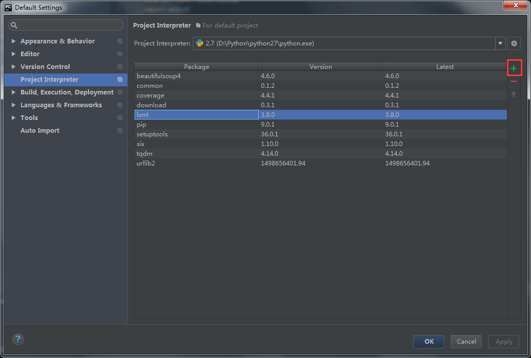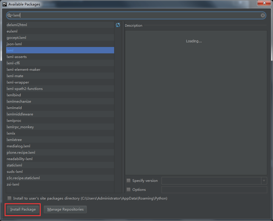 3、搜索"lxml",之后选择lxml点击安装,如图所示: