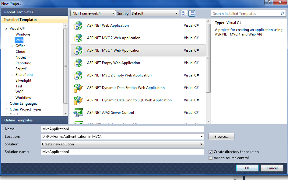 打开Visual Studio 2010 > New Project > Select ASP.NET MVC 4 Web Application 点击确认。