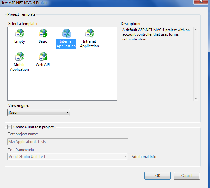 然后选择Internet Application点击确认,Forms认证所需要的Controller 和View等等都会默认包含在我们的项目里面了。
