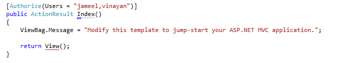授权允许我们传递一些参数去设置规则,我们可以告诉Authroize属性只有某些具体用户才可以访问某个Action。
