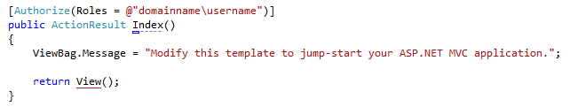 同时 ,我们还可以为Authorize属性指定 Roles。这些Roles默认匹配到我们web服务器的Windows Group或者是域管理器里面的用户组。