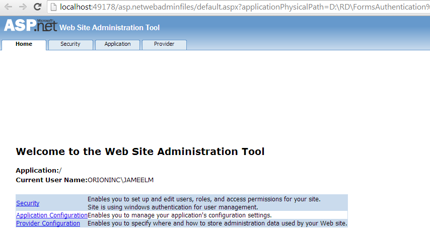点击上面这个按钮之后,它会帮我们运行ASP.NET configuration tool。这个站点只能在本地运行,我们可以在这个站点管理我们的角色,这个站点默认使用的数据连接就是我们配置在web.config中的连接字符串。