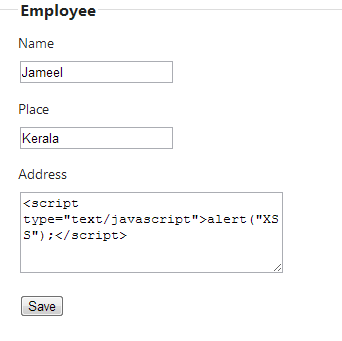 这是一个简单的录入员工信息的页面,我们输入一些html代码然后保存页面。ASP.NET默认会去检测我们的request,发现类似html代码会直接拒绝我们的请求。
