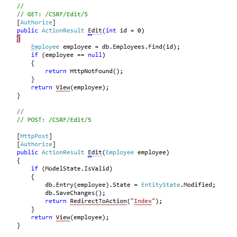 这里有一段很常见的代码,通过Edit Action来编辑用户信息。我们已经为Edit 打上了Authorize属性,也就是说用户是需要登录才能访问这个Action的。从普通开发的角度来看,这个程序是不会有什么问题的,我们首先通过正常渠道添加了一个用户。
