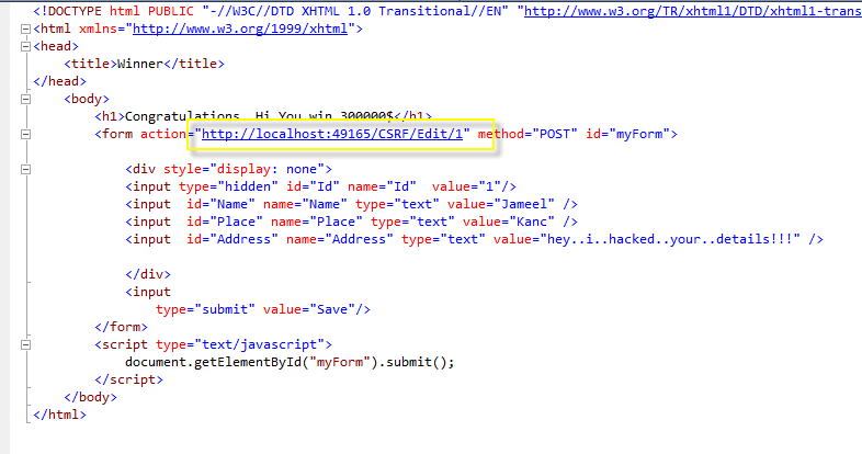 非常的简单,我们只需要将form的action指向实际的action就可以了。这个页面一旦被加载,这个表单就会自动提交,那我们的数据就被黑了,一切都是那么的简单。