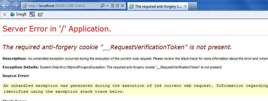 跨站请求伪造也是一种危险的主流攻击。试想一下,某个用户登录到网站想修改一些个人信息,如果服务器端使用了Forms认证,那么在这个用户登录之后就会得到一个包含身份信息的cookie并且在后面所有这个站点下的请求中传递。当然这个并没有错,毕竟如果每次都去验证用户名和密码是一次不小的开销,验证一次之后将登录信息保存到cookie中,至少在用户不关闭浏览器之前,我们不用再重新去验证用户。